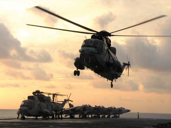 The aircraft carrier Charles de Gaulle is carrying its complement of fighter aircraft Rafale M, Strike aircraft super Eternard, E2C Haekeye AWACS and helicopters Dauphin and Alouette 3.