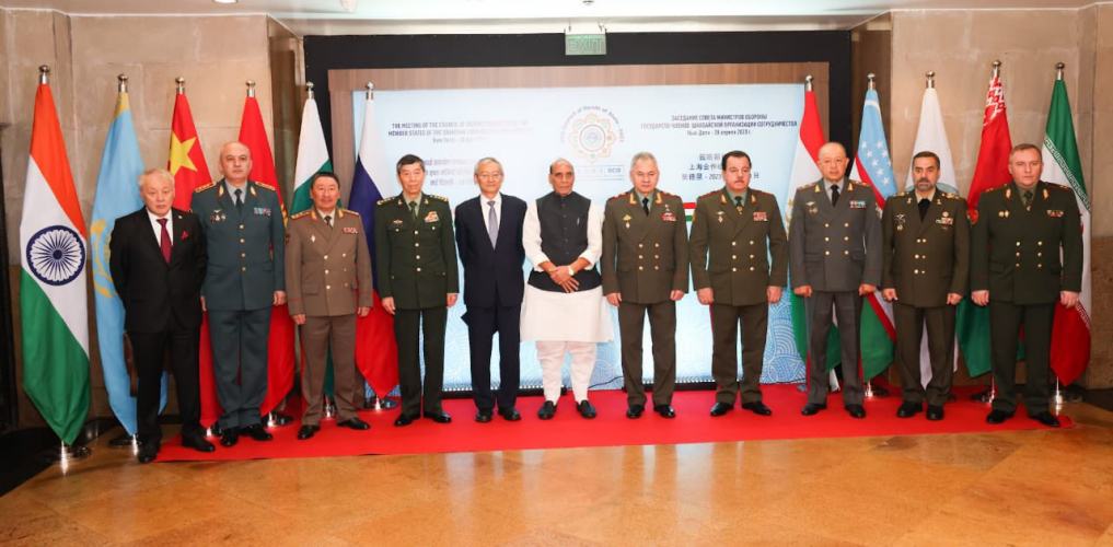 Caption: Defence Minister Rajnath Singh with Russian Defence Minister Sergei Shoigu before a group photo during the Shanghai Cooperation Organisation (SCO) Defence Ministers' Meeting, in New Delhi, Friday, April 28, 2023. A PTI Photo