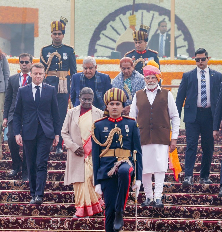 Soon after, Murmu and Macron left from the Kartavya Path in the 'buggy', which made a return after 40 years. After the end of the parade, PM Modi, wearing a multi-coloured 'bandhani' print safa, mingled with the excited crowd as people clicked pictures and welcomed him with claps and slogans of "Bharat Mata Ki Jai".